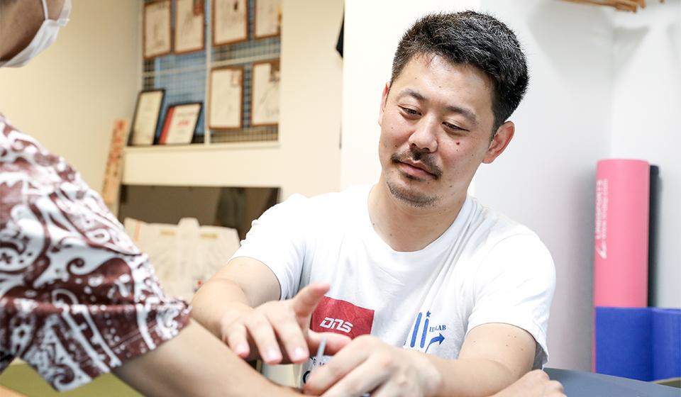 鍼灸院を経営し、自ら診療を行っています。「出会った人を『なんとかしたい』」というコンセプトを掲げ、スポーツ選手から痛みを抱えた一般の方まで幅広く対応しています。当院は保険を適用しない自費診療で、ひとり一人に合せたオーダーメイドの施術を特色としています。鍼を使いながらトレーナーの観点も交えて施術できるのは、アスレティックトレーナー学科と鍼灸学科の両方で学んだから実現できている業態です。