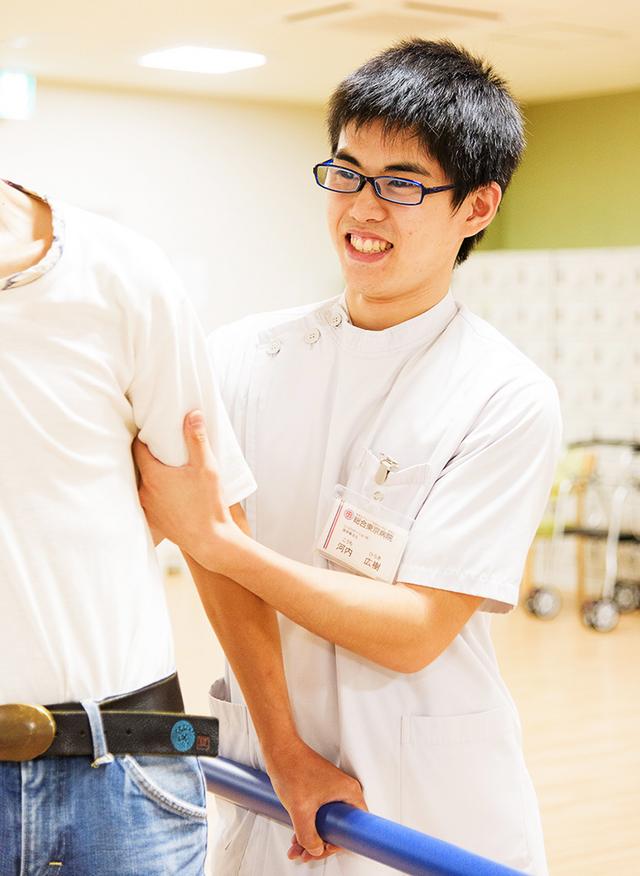 現在は外来の患者さんのリハビリテーションを担当しています。入職当初は、患者さんをよくしたいという思いが強すぎて、ついペースを上げてしまうことが多かったのですが、今は患者さんをあまり疲れさせないように心がけています。今後も患者さん個々のペースに合わせながら、希望に添えるリハビリをしていきたいと思います。まだ新人なので仕事を楽しむ余裕まではありませんが、最近では慌てることはなくなりました。課題は周囲をよく観察することです。目の前の患者さんだけに集中するのではなく、周りの状況にも注意を払い、必要に応じて手助けをしたり、声をかけにいったりする機転も必要だと先輩から助言されています。