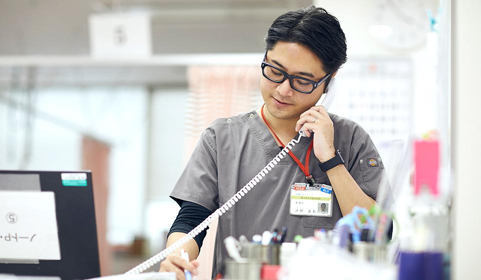 患者さんを救うために必要不可欠なのが「チーム医療」です。救急外来の看護師の場合、医師、救急救命士などの職種との関わりが多くあるなかで、救急救命士とは直接患者さんを引き継ぐという大切な連携があるのですが、その際、同じ母校出身の救急救命士と一緒に仕事をしていた時期がありました。彼とは同期でプライベートでも仲が良く、入職してからともに育ってきた間柄です。当院の救急救命士は彼も含めて非常に優秀で、法律の範囲内ではありますが、看護師と同じレベルで患者さんを診る力量を持っています。これは看護師としてはとてもありがたいこと。この膨大な件数をこなせるのは、ハイレベルな救急救命士の存在があるからです。