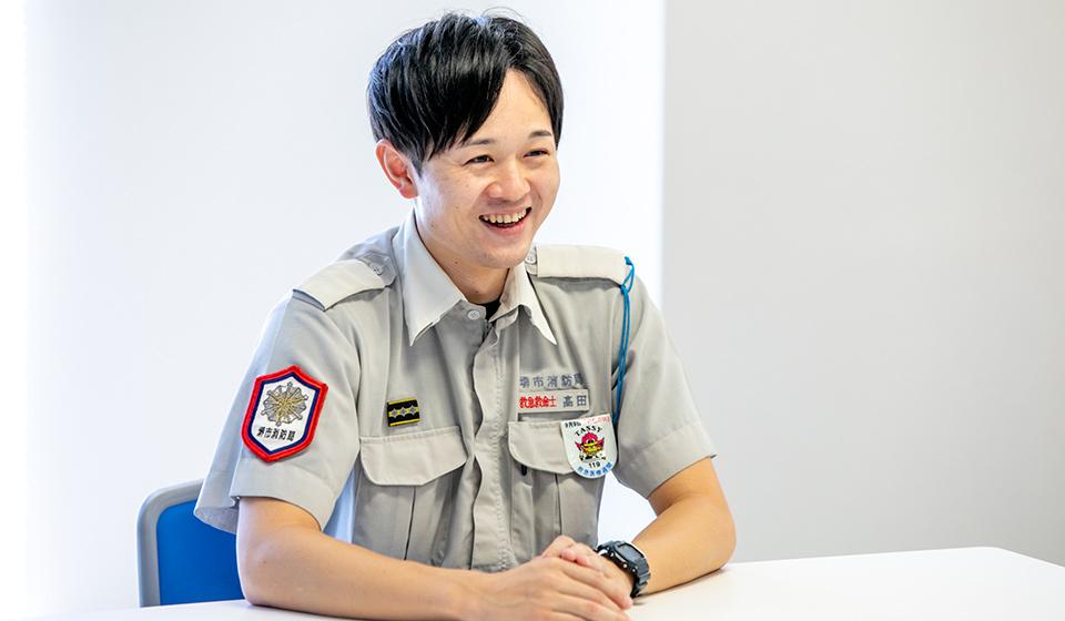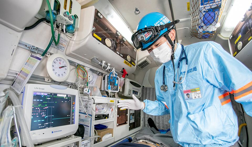 私が所属する堺市消防局救急部救急ワークステーションは、堺市立総合医療センターに併設しており、119番通報内容から重症と思われる事案に対して、医師や看護師が同乗出場する特別救急隊を運用しています。また、消防局の救急業務に携わる職員に対する教育指導を担っています。