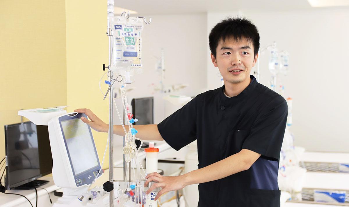 人工透析を専門とするクリニックで臨床工学技士を務めています。透析は患者さんと密にかかわれる仕事。この点に魅力を感じて、学生時代から希望していました。透析の仕事は患者さんとの信頼関係が欠かせません。人間関係の基本である挨拶はもちろん、穿刺(せんし)、血圧測定といったタイミングを捉えてのコミュニケーション、血圧が下がっている方に対する「ご気分はいかがですか?」といったお声がけなどを通じて、患者さんに寄り添うことを心掛け、信頼関係の構築に努めています。