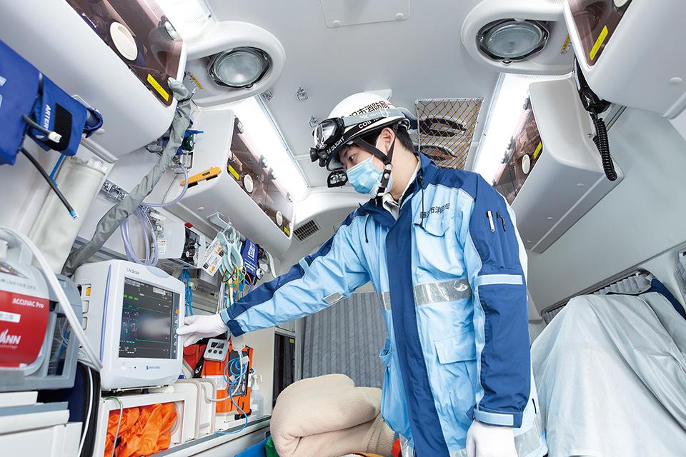 所内では私が一番の年少者で、救急業務に携わってようやく半年ほど。他の隊員と比べたら圧倒的に経験が足りませんが、救急車に乗り込む3人の隊員のうち、傷病者やそのご家族に一番長く接するのは、車内後部に搭乗する私の役目です。少しでも傷病者やご家族に安心感を感じてもらえるよう、接遇には常に力を入れています。搬送先に到着するまでの声かけであったり、バイタルサインを観察しながら他に痛みや不安なところがないか、傷病者の気持ちをくみ取っていくことであったり。搬送先の医師にしっかりと傷病者の状態を情報提供するためにも、その方を「深く知ろう」と寄り添い、きめ細やかに対処できるよう心がけています。