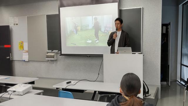 前半は、「スポーツトレーナーとして、『即、戦力』になるために大切にしている4つのこと。」をテーマに、プロ野球選手や、テニス全仏オープン混合優勝の柴原瑛菜選手、プロボクサーなど、幅広い選手の事例をもとに説明いただきました。 木村トレーナーが1年間サポートして、今年最優秀中継ぎ投手に輝いた選手から、学生にむけて、「(スポーツトレーナーなど)大変な職業だと思いますが、夢に向かって頑張ってください」と、ビデオメッセージをいただきました。
