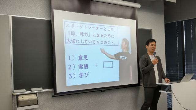 トップアスリートのトレーナーである木村匡宏さんをお招きし、講義を行いました。木村トレーナーはオリンピック選手やメジャーリーガーをはじめ、世界で活躍する選手から子どもまでサポートしています。新庄剛志監督のトライアウト挑戦の際もサポートされました。
