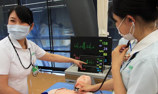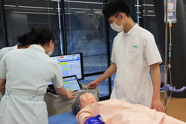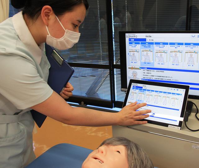 名古屋医専では病院と同じ機器を導入し、より実践的な環境を整えていますが、このたび多職種連携ハイブリッドシミュレーターの「シナリオ」を導入しました。 「シナリオ」は、顔色の変化や生体情報モニター、脈の触知や血圧測定、パルスオキシメーターや体温計の計測なども可能で、手技項目は40項目以上。しかも在宅や病棟、レベルの異なるシナリオが多数用意されているので、状況変化にも対応することができます。 さっそく授業ではシミュレーターを用いた講義・演習を行いました。