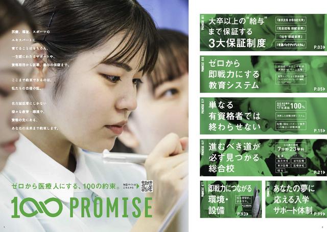 今年度の表紙には、看護師・理学療法士・作業療法士・臨床工学技士・救急救命士・歯科衛生士・アスレティックトレーナー・柔道整復師・鍼灸師・介護福祉士など自分の目指す医療人に向かって学ぶ医療の総合校ならではの実際の学生たちを起用しました。 学生が100人いれば、100通りの人生があります。 医療を志すきっかけも、理由も、時期も、みんな違う。 だけど、どんな人であっても、 100の約束で徹底的にサポートし、ぜったいに医療人にする。 そんな学校としての想いをこめた案内書となっています。学校紹介、学びの内容、卒業生の声など、最新情報を豊富に掲載しています。
