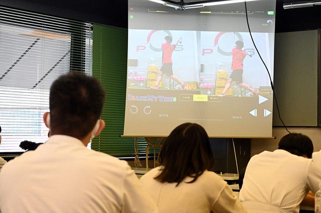 前半は、「スポーツトレーナーとして、『即、戦力』になるために大切にしている4つのこと。」をテーマに、プロ野球選手や、テニス全仏オープン混合優勝の柴原瑛菜選手、プロボクサーなど、幅広い選手の事例をもとに説明いただきました。 木村トレーナーが1年間サポートして、今年最優秀中継ぎ投手に輝いた選手から、学生にむけて、「(スポーツトレーナーなど)大変な職業だと思いますが、夢に向かって頑張ってください」と、ビデオメッセージをいただきました。