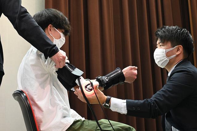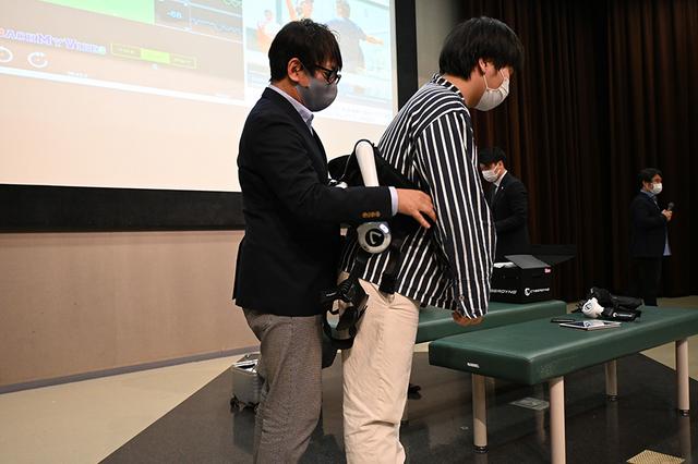 講義では、サイバーダインの会社説明や「HAL」の仕組みや医療分野での活用事例などについて紹介いただきました。また「HAL」の腰や腕に使用するタイプの実機も試用させていただきました。歩いたり腕を動かすと、センサーが読み取り、連動して機器が動く様子に、感動していました。