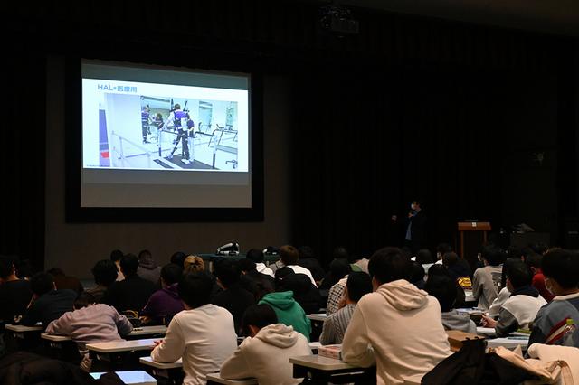 CYBERDYNE株式会社(以下、サイバーダイン)取締役 営業本部長の安永好宏氏をお招きし、特別講義を実施いただきました。 サイバーダインが手がける装着型サイボーグ「HAL」は、人が体を動かそうとする際の信号を検出し、装着者の意思に従った動作を実現する世界初の革新技術です。福祉や医療分野、災害現場での復興支援活動などに活用の場が広がっています。