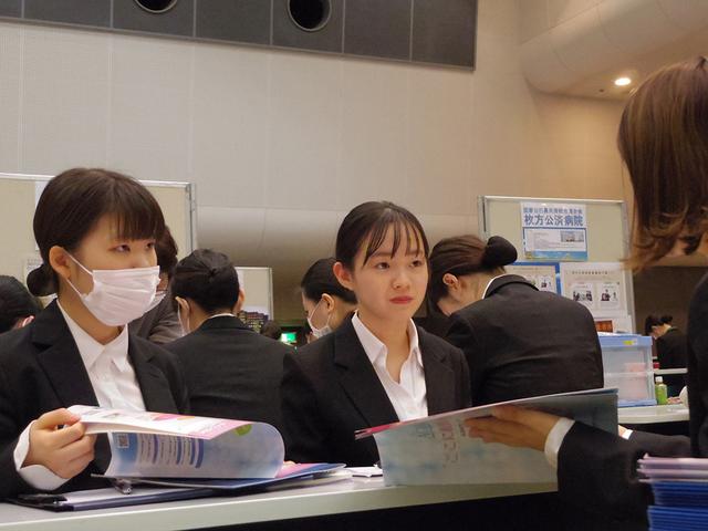 今年度も、30を超える大阪府近郊の中核病院・施設の担当者が来校。 多くの病院・施設では、大阪医専看護学部卒業生も来校し、実際の現場での体験談を話してくれました。 参加した約250名の学生たちは、将来を考え積極的に複数の病院の説明を聞き、会場は活気にあふれました。