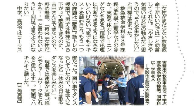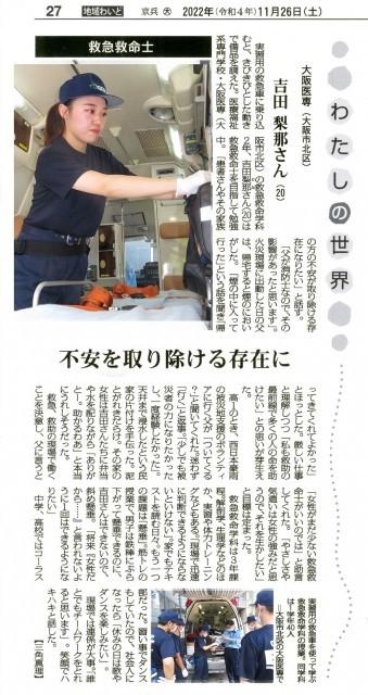 『毎日新聞 わたしの世界』に大阪医専 救急救命学科 吉田梨那さんが掲載されました。 大阪医専での授業の様子なども紹介されています。 記事の内容は画像でご覧ください。 ------------------------------------------- <掲載記事> 毎日新聞:救急救命士 大阪医専(大阪市北区) 吉田梨那さん(20) 不安を取り除ける存在に ------------------------------------------- ■大阪医専の救急救命学科 1)国家試験合格率 100%※2022年3月実績(2022年全国平均91.3%) 2)学内に高規格救急車を完備!現場を想定したリアルな実習訓練 3)看護分野をはじめ他学科と学ぶ独自の「連携授業」を実施 4)経験豊かな特別講師が直接指導「特別講義」 5)リアルな救急救命の現場を再現 実戦さながらの救命シミュレーション公開訓練 6)NO.1の技術力!部門別1位を獲得!西日本学生救急救命技術 選手権大会 ------------------------------------------- 大阪医専のキャンパスライフや授業の内容についてはオープンキャンパスで確かめてみよう! 🖊️