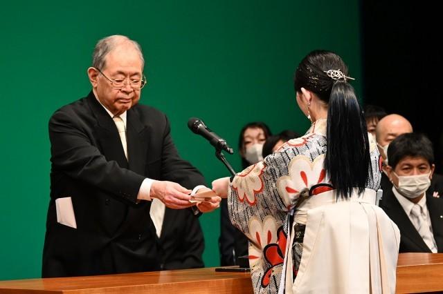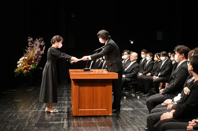 表彰式では、本学独自の『校費留学制度』の対象者へ認定証を授与。この制度は、アメリカやヨーロッパなど医療・福祉先進国の専門学校や大学へ留学し異文化での研究活動に接することで、既成の発想の枠を超えたエキスパートの育成を目的としており、必要な渡航費・学費(1年間分)は本学が支援します。今年度は希望者の中から歯科衛生学科の学生が選ばれ、カナダへの留学が決定しました。