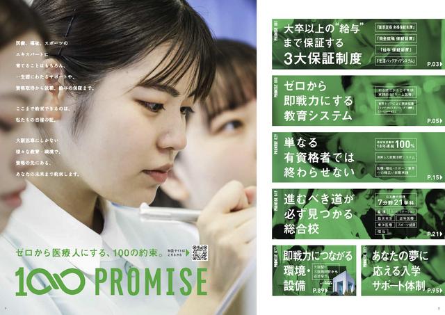 今年度の表紙には、看護師・理学療法士・作業療法士・臨床工学技士・救急救命士・歯科衛生士・アスレティックトレーナー・柔道整復師・鍼灸師・介護福祉士など自分の目指す医療人に向かって学ぶ医療の総合校ならではの実際の学生たちを起用しました。 学生が100人いれば、100通りの人生があります。 医療を志すきっかけも、理由も、時期も、みんな違う。 だけど、どんな人であっても、 100の約束で徹底的にサポートし、ぜったいに医療人にする。 そんな学校としての想いをこめた案内書となっています。学校紹介、学びの内容、卒業生の声など、最新情報を豊富に掲載しています。