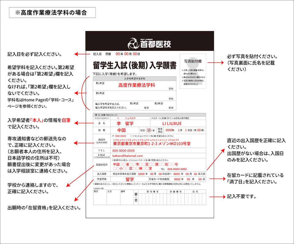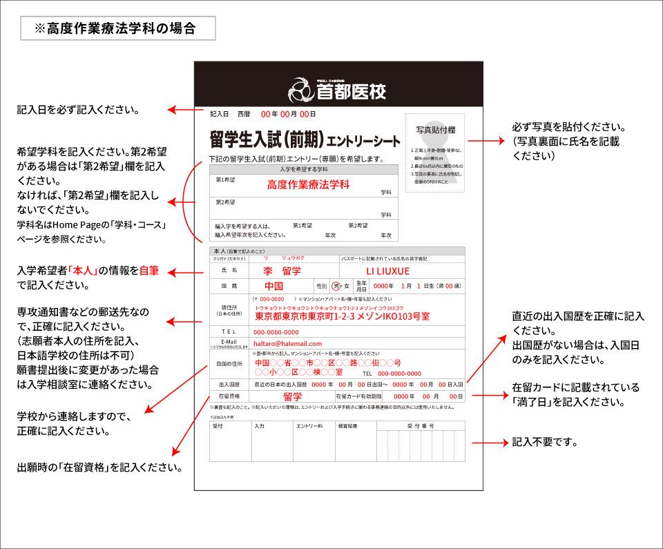 | 郵送の場合 | 【宛先】 〒160-0023 東京都新宿区西新宿1-7-3 首都医校 入学相談室行 留学生入試(前期)エントリーシート在中 |