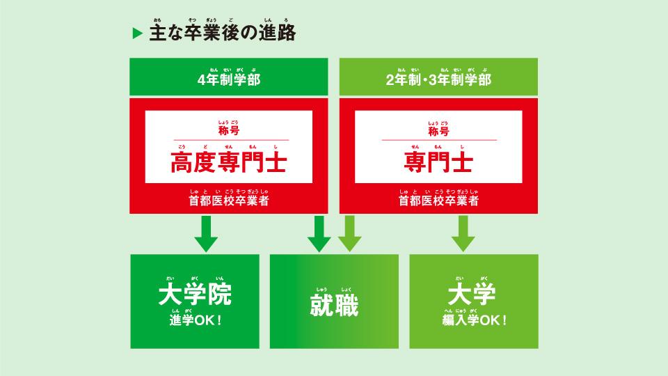4年制課程(昼間部)を卒業時には、卒業証書の授与と、文部科学省制定による称号「高度専門士(Advanced Diploma)」が付与されます。これは4年制大学卒業と同等として認められ、日本の大学院への入学資格も与えられる称号です。また、2年以上の課程(昼間部)を卒業時には、卒業証書の授与と、文部科学省制定による称号「専門士(Diploma)」が付与されます。これは短期大学と同等の卒業資格として認められます。