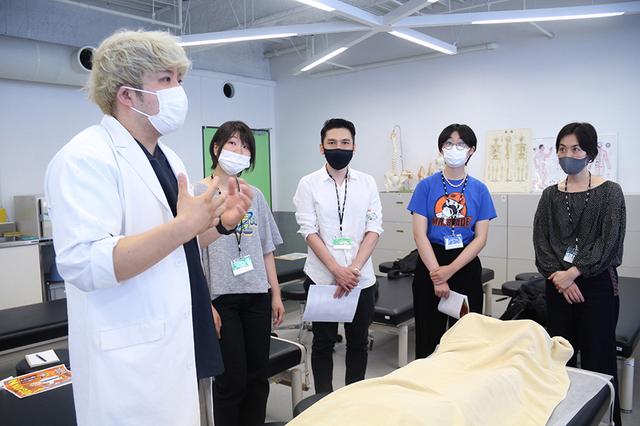 医療という枠を越え、スポーツや美容分野など活躍の幅が広がり、将来は自分の施術所を開業できる鍼灸師(はり師・きゅう師)。 いま、新しい活躍の場として、音楽シーンで大活躍している鍼灸師が「メガパン先生」こと野田先生です。フェスや全国ツアーを回る著名アーティストたちからも信頼が厚く、“アーティスト専門鍼灸師”として活躍しているメガパン先生には、本学の特別講師に就任いただいていますが、今回は体験入学にて特別授業を実施いただきました。