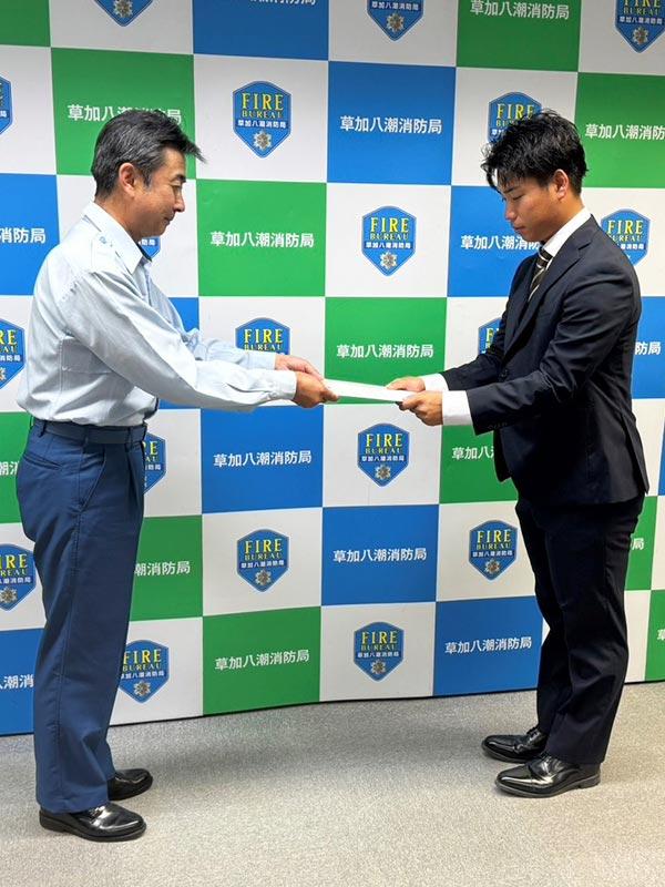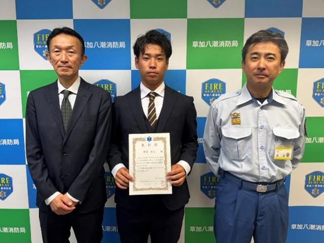 埼玉県東部地域メディカルコントロール協議会から首都医校 救急救命学科の中島学人さんに人命救助の感謝状が贈られました。 交通事故を目撃し、これまでの授業で習得した圧迫止血などの応急手当の知識と技術を活かし、負傷者に対して迅速かつ適切な処置を行いました。現場に駆けつけた救急隊も、学生の初期対応が傷病者の予後改善に大きく寄与したと評価しています。 協議会を代表し草加八潮消防局長南雲仁様は、「たとえ知識があったとしても、それを行動にうつすことは難しい、今回の勇気ある行動に心から感謝いたします」と述べられました。