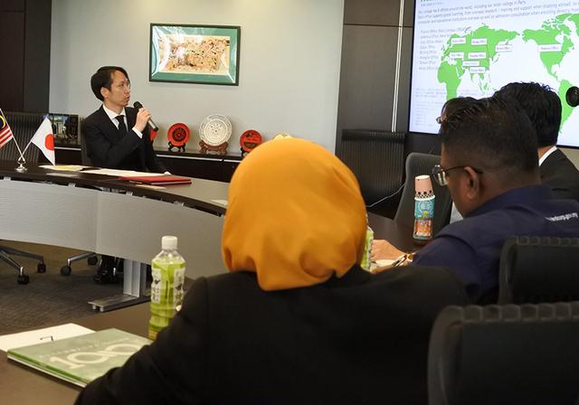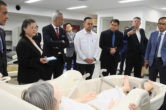 校舎や実習室・設備を見学。介護実習室では、車椅子ごと入浴できる特殊浴槽の機械をご覧いただきました。マレーシアには浴槽に入る文化はないものの、日本の最近技術に触れ、また実際の医療現場を再現した実習室や器具が教育機関に完備されていることに大変驚かれていました。 大学卒業と同等の「高度専門士」という称号や、本学の実践を重視した教育プログラムなど説明しました。視察団は教育体制に対し熱心に耳を傾けられただけでなく、多種多様な留学生を受け入れている学校が少ないことから、「視察を通じてあらためて協業の余地を感じ、今後とも連携していきたい」と、前向きな言葉を頂戴しました。