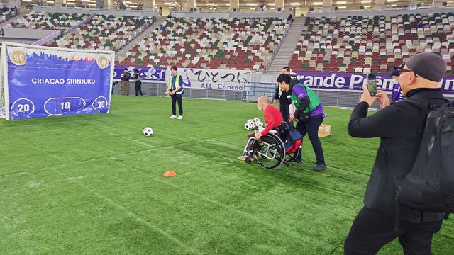 本学では東京23区から初のJリーグ昇格を目指すJFLのクリアソン新宿と包括連携協定を締結し、誰もがサッカーを楽しめる環境づくりや地域活動、選手たちのトレーニングのサポートなどを実施しています。 今回、11月11日に国立競技場で開催された明治安田「サッカーの日」マッチ(クリアソン新宿 対 アトレチコ鈴鹿)において、本学の高度作業療法学科/作業療法学科の加藤駿一教官が、作業療法士として新宿区障害者福祉協会と共に車いす利用者の観戦をサポートしました。
